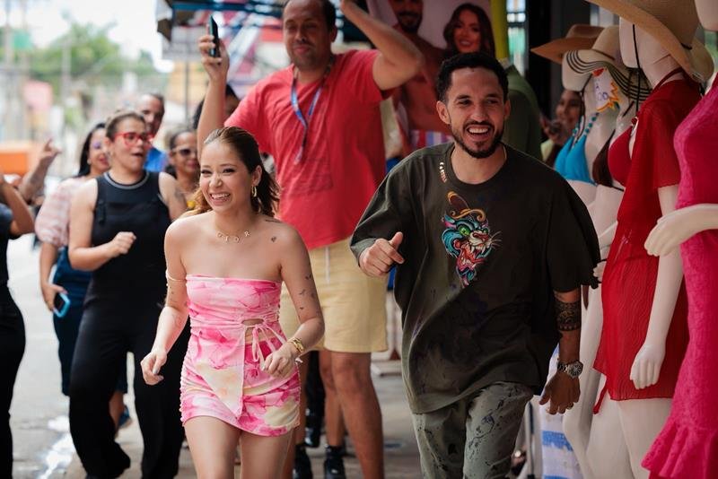 Em seguida, Grelo surge de maneira inusitada, caracterizado como mendigo, quebrando expectativas e despertando curiosidade. Já Theuzinho aparece em grande estilo, em cima de um trio elétrico, elevando o impacto visual e transformando o cotidiano da rua em um verdadeiro espetáculo.